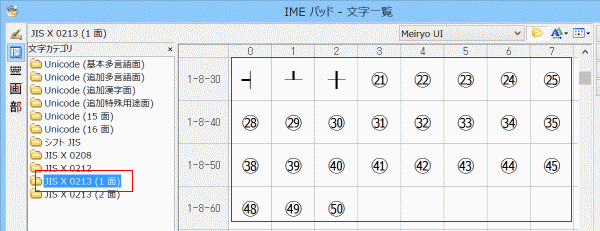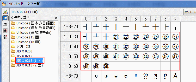 - JIS X 0213(1面) を選択して、下の方へスクロールすると、21〜50の丸囲み数字が表示されます。