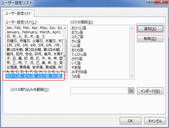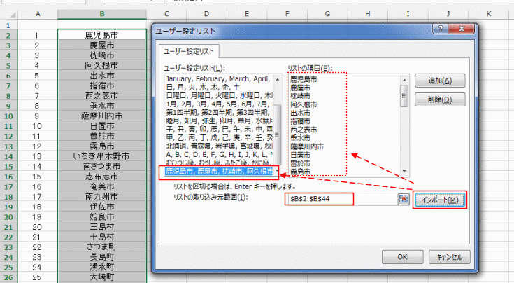 - リストの取り込み元範囲に入力した連続データの範囲を指定します。