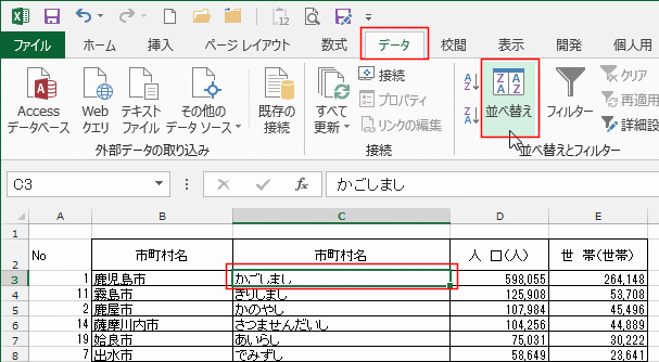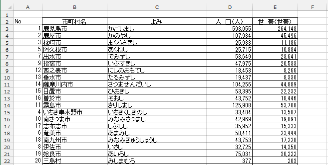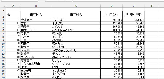 - 下図の鹿児島県の市町村別人口のデータがあります。