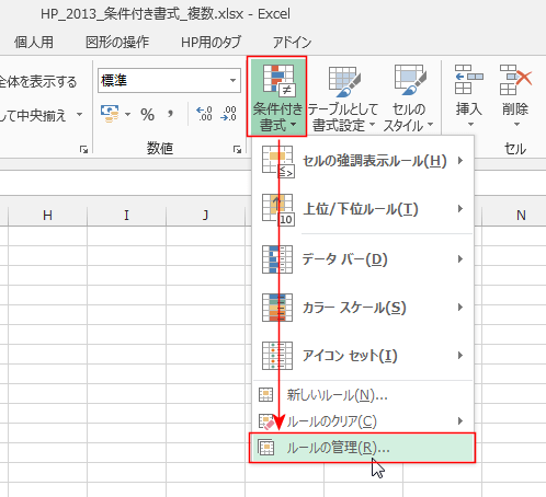 - [ホーム]タブの[条件付き書式]→[ルールの管理]を実行します。