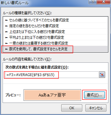 数式 「=F3>AVERAGE($F$3:$F$15)」と入力します。