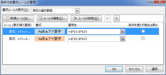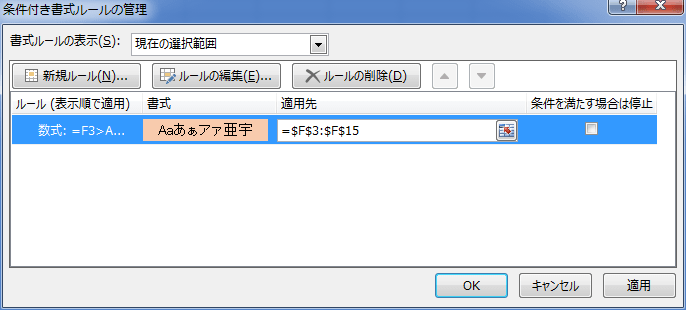 - 条件付き書式を設定する合計のセル範囲 F3:F15 を選択します。