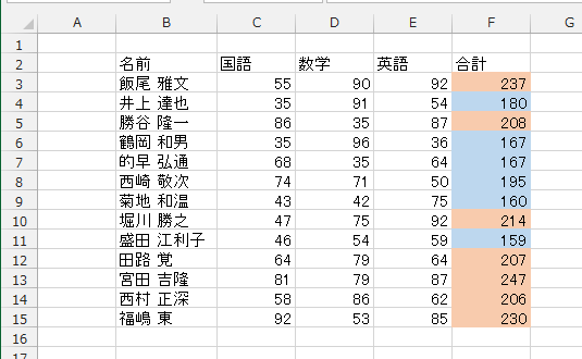 - 合計が平均より大きかったら赤色系の色でセルを塗りつぶし、平均値以下なら青色系の色でセルを塗りつぶします。