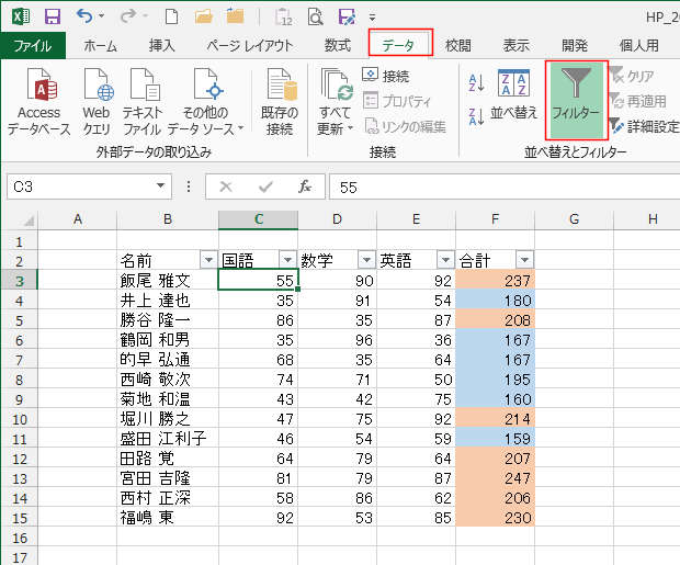 - フィルターの色フィルターを使ってデータを抽出したいと思います。