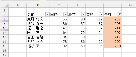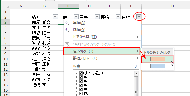 - 列見出し「合計」のフィルターボタンをクリックして、[色フィルター]→「抽出したいセルの色」を選択します。
