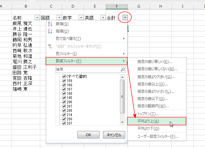 - [数値フィルター]→「平均より上」で実行します。