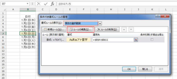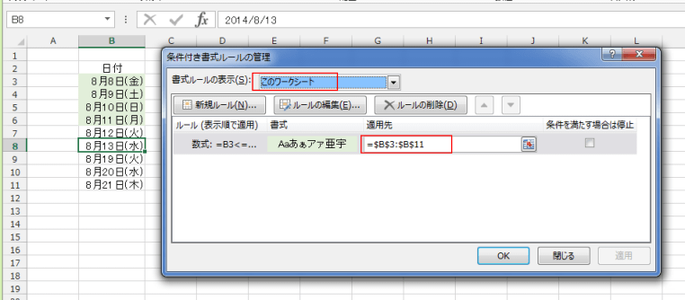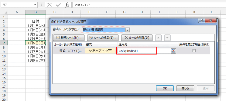 ルールの管理の画面では「適用先」の欄があります。ここには「=$B$4:$B$11」と表示されています。