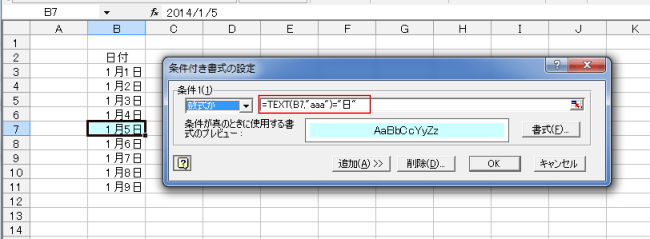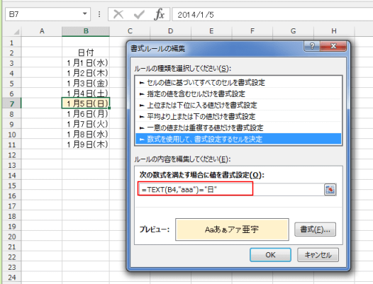 - 数式を見ると・・・ =TEXT(B4,"aaa")="日" となっています。