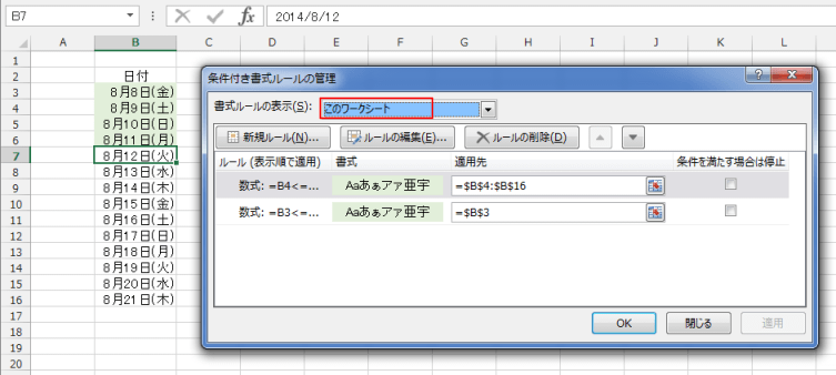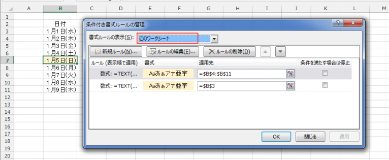 書式ルールの表示で「このワークシート」を選択しています。2つの条件付き書式のルールがあるのが分かります。