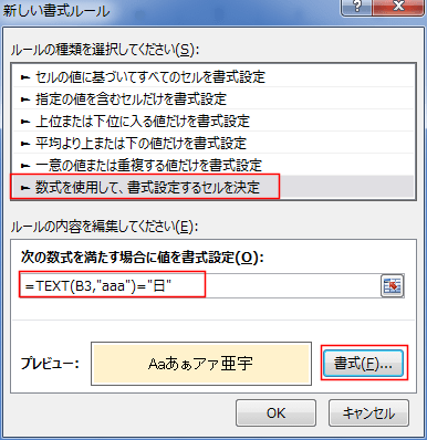 - 「数式を使用して、書式設定するセルを決定」を選択し、数式「=TEXT(B3,"aaa")="日"」を入力しました。