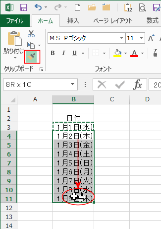 マウスポインターが刷毛の形に変わりますので、B4:B11セルをドラッグして書式を貼り付けました。
