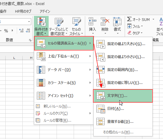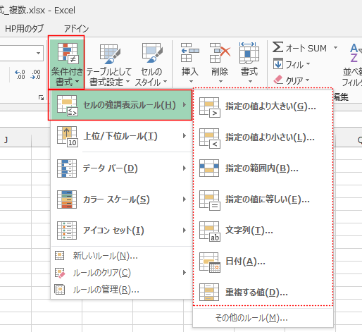 - [ホーム]タブの[条件付き書式]→[セルの強調表示ルール]から選択します。