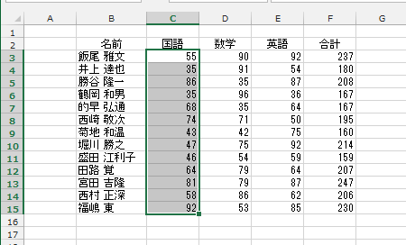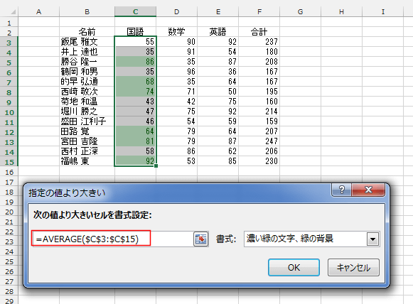 - =AVERAGE($C$3:$C$15) と入力した例です。平均値よりも大きい値のセルの書式が変化します。