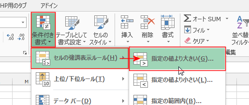 - [ホーム]タブの[条件付き書式]→[セルの強調表示ルール]→[指定の値より大きい]を選択します。