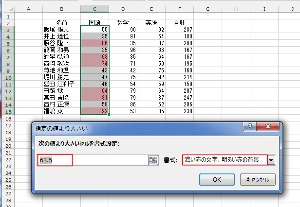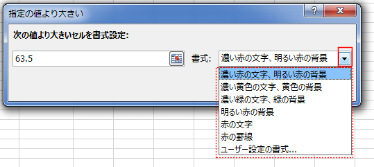 条件と一致したセル(セルの値が63.5より大きいセル)に設定した書式が反映されました。