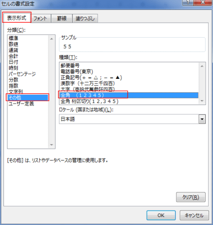 [表示形式]タブを選択して、「その他」「全角 (12345)」を選択しました。