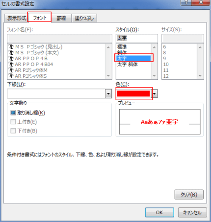 - [フォント]タブを選択して、スタイルで「太字」、色で「赤」を選択しました。