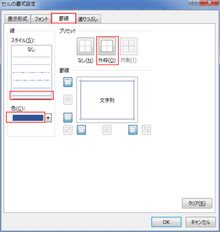 - [罫線]タブを選択して、スタイルで「直線」、色で「青」、プリセットで「外枠」を選択しました。