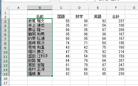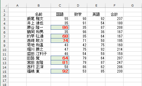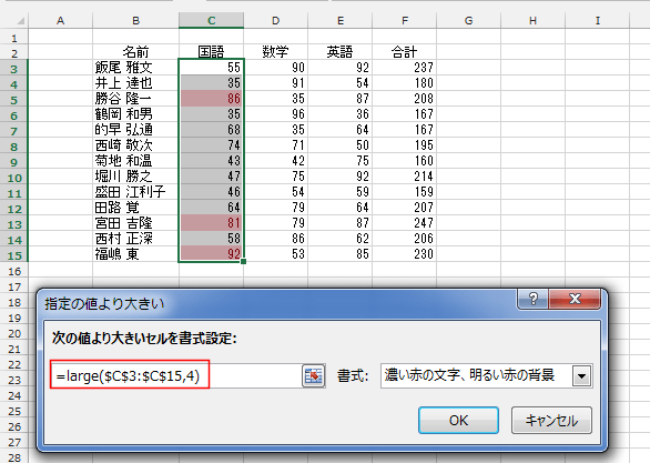 - =LARGE($C$3:$C$15,4) と入力した例です。上位3つのセルの書式が変化します。