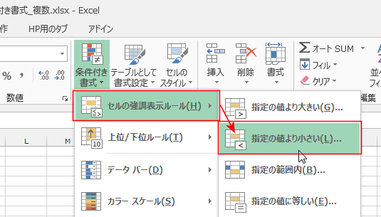 - [ホーム]タブの[条件付き書式]→[セルの強調表示ルール]→[指定の値より小さい]を選択します。