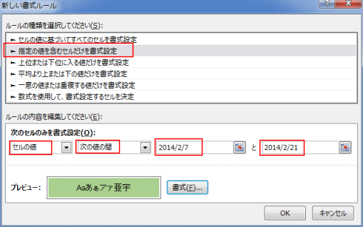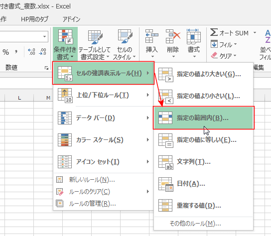 - [ホーム]タブの[条件付き書式]→[セルの強調表示ルール]→[指定の範囲内]を選択します。