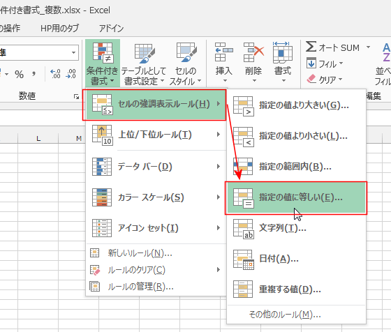 - [ホーム]タブの[条件付き書式]→[セルの強調表示ルール]→[指定の値に等しい]を選択します。