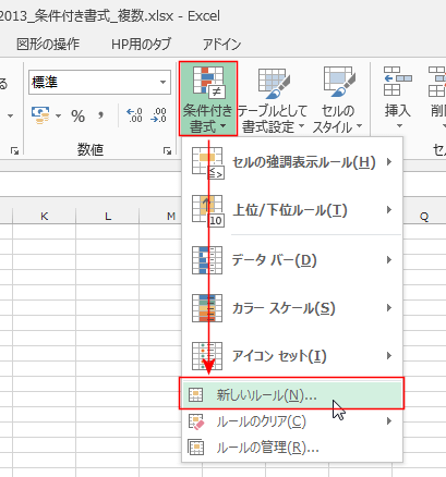 - [ホーム]タブの[条件付き書式]→[新しいルール]を選択します。