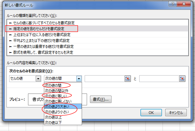 - セルの強調表示ルールから選択できる条件は、新しいルールからも選択することができます。
