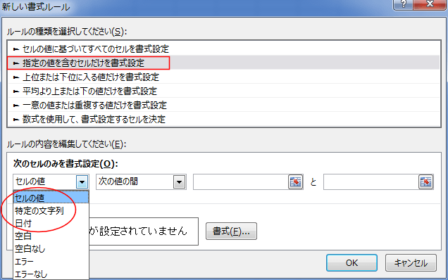 - 文字列や日付に関する条件は「指定の値を含むセルだけを書式設定」を選択して、ドロップダウンリストから条件の対象を選択することができます。