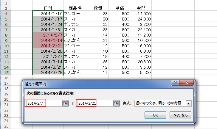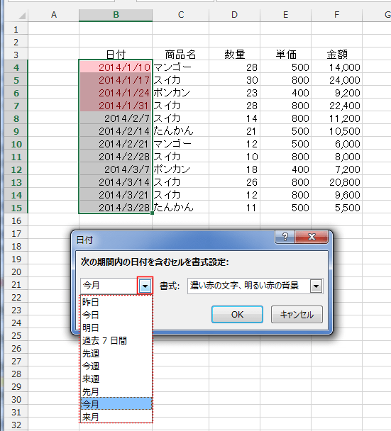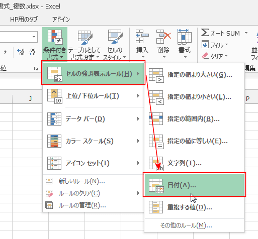 - [ホーム]タブの[条件付き書式]→[セルの強調表示ルール]→[日付]を選択します。