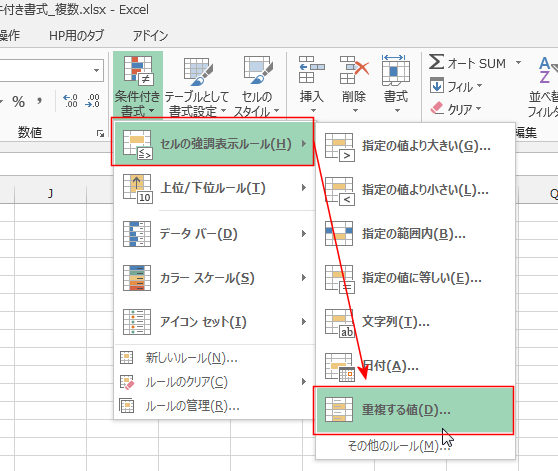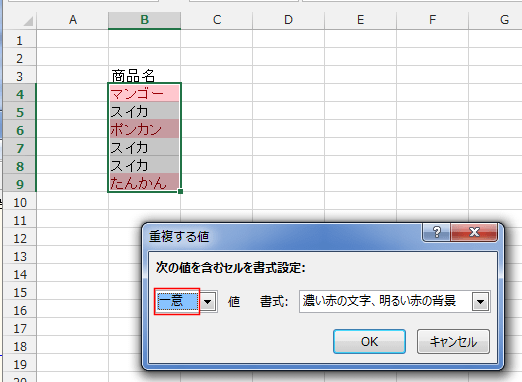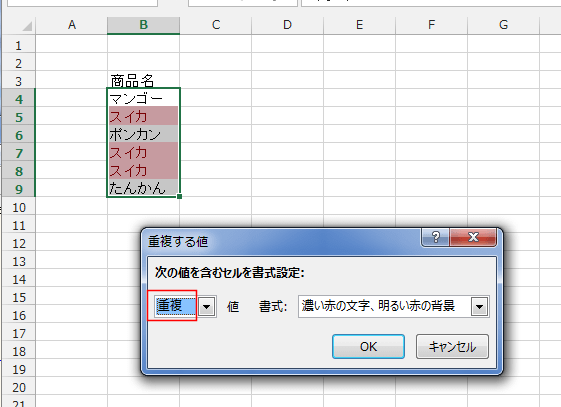 - 「重複」を選択すると、重複した値のセルが対象となります。