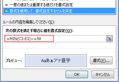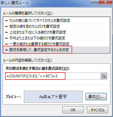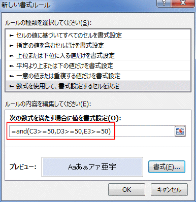 数式を =COUNTIF(C3:E3,">=50")=3 としました。