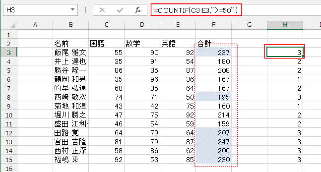 - 説明のために、H列には=COUNTIF(C3:E3,">=50") と入力しています。