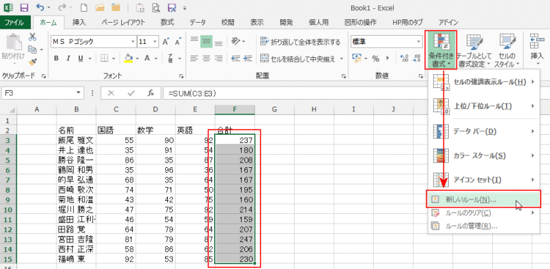 - 書式を変えたいセル範囲 F3:F15 を選択して、[ホーム]タブの[条件付き書式]→[新しいルール]を実行しました。