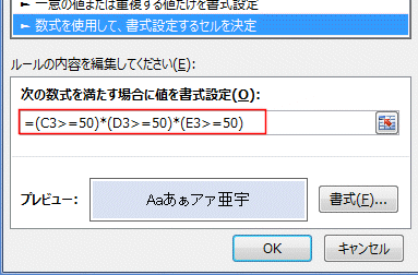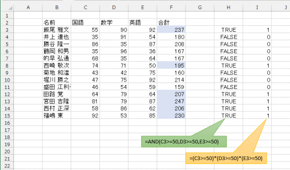 - 論理式で =(C3>=50)*(D3>=50)*(E3>=50) 書くこともできます。