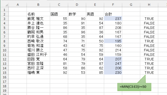 - 説明のために、H列には=MIN(C3:E3)>=50 と入力しています。