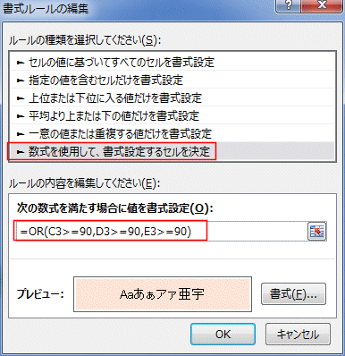 数式を =OR(C3>=90,D3>=90,E3>=90) としました。