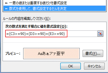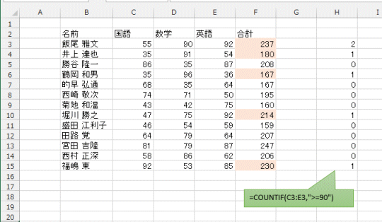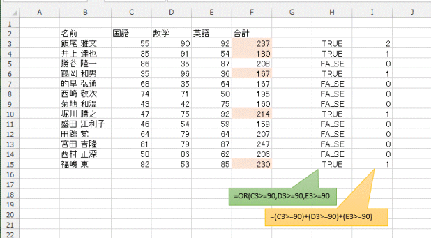 - 論理式では =(C3>=90)+(D3>=90)+(E3>=90) と書くことができます。