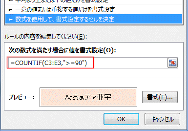 - 条件はいずれかが90以上ですので、90以上のセルを数えて1以上であればよい・・・と考えることもできます。