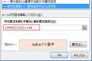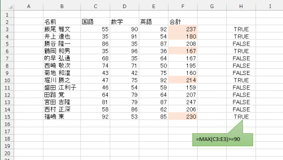 - 数式は =MAX(C3:E3)>=90 とすればよさそうです。