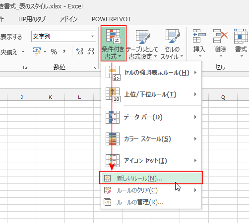 - [ホーム]タブの[条件付き書式]→[新しいルール]を選択します。