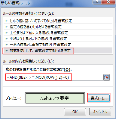 MOD(ROW(),2)=0 行番号を2で割った余りが0 、つまり、偶数行であるとう条件にしています。