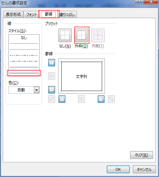 実線を選択して、「外枠」に実線を設定しました。