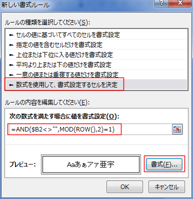 MOD(ROW(),2)=1 行番号を2で割った余りが1 、つまり、奇数行であるとう条件にしています。