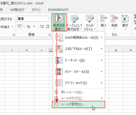 [ホーム]タブの[条件付き書式]→[ルールの管理]を選択します。
