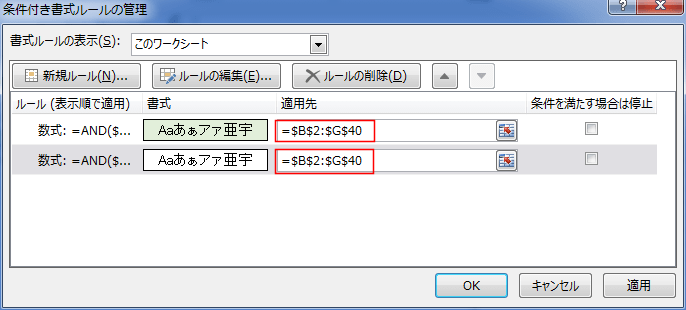 - 適用先のセル範囲を修正します。ここではB2:G40へ変更しました。