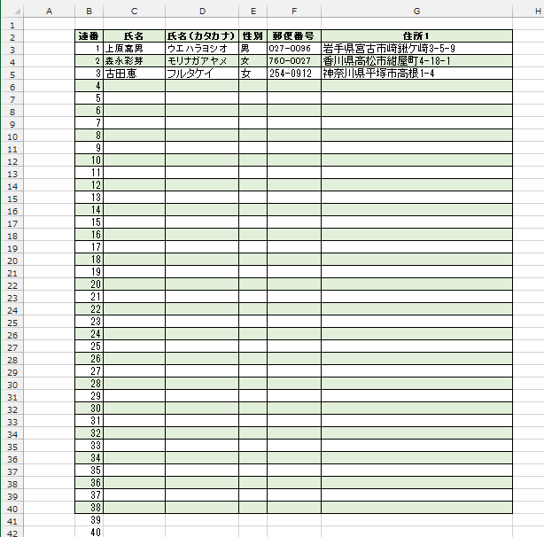 - 下図のようにB40まで入力すると、40行目まで条件付き書式が設定されているのが確認できます。