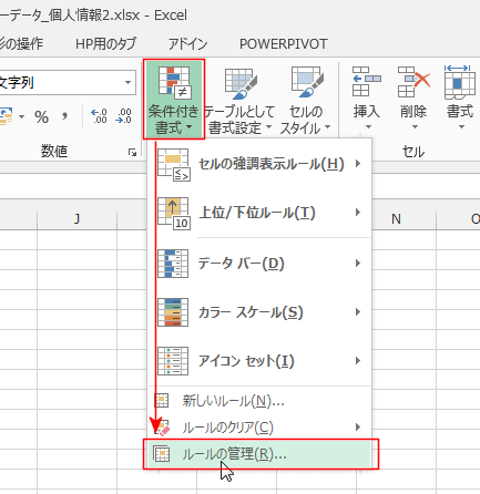 - [ホーム]タブの[条件付き書式]→[ルールの管理]を実行します。