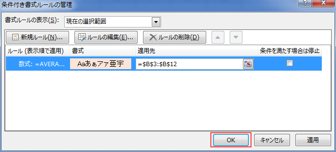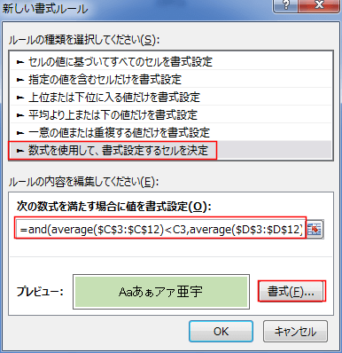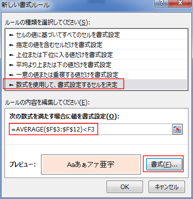 次の数式を満たす場合に値を書式設定に、数式「=AVERAGE($F$3:$F$12)<F3」と入力します。