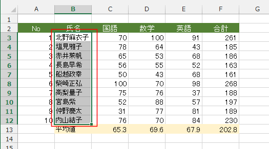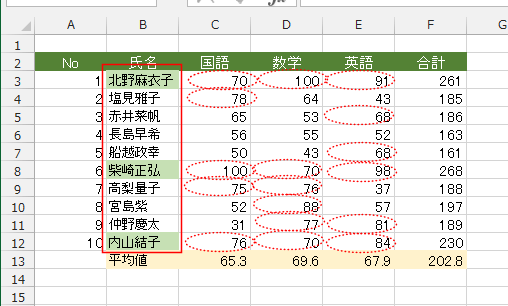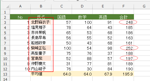 ここでは、国語、数学、英語の得点がすべて平均点を超えている場合、氏名のセルを塗りつぶしたいと思います。